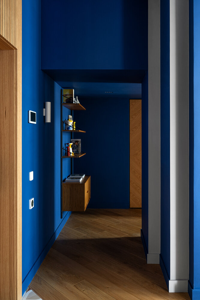 Смелый эксперимент в трешке 91 м²: буйство красок, раковина в прихожей и настоящий каминДизайн