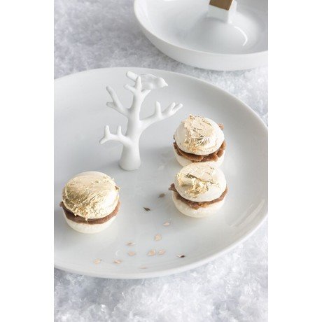 Блюдо изготовлено из белой керамики вручную с небольшой россыпью золотых листиков, как будто бы опавших с дерева, расположившегося в центре тарелки. Деревце также изготовлено из керамики, правда имеет слегка шероховатую текстуру. На его вершине расположилась птичка.