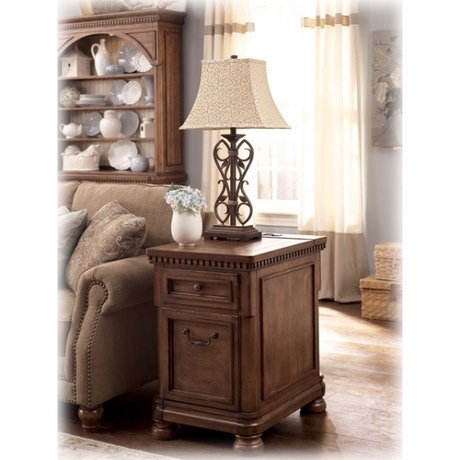 Придиванный столик на маленьких ножках, выполненный из шпонированного твердыми породами массива. Столик светло-коричневый, слегка состаренный, выточенный в традициях классики. Под столешницей расположилась оригинальная резьба. Специальная панель в задней части столика скрывает порты питания для зарядки мобильных устройств. Места для хранения скрыты за фасадами, украшенными фурнитурой под состаренную бронзу.