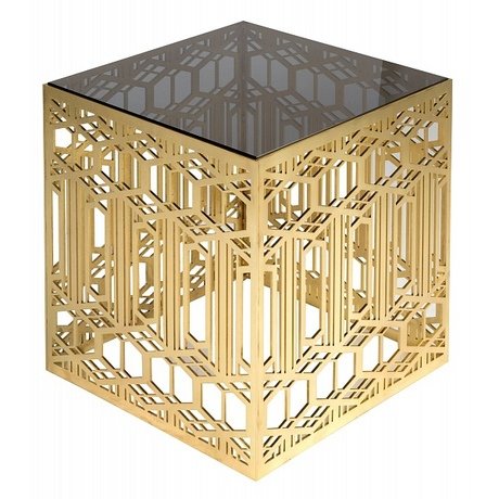 Журнальный стол с металлическим основанием золотого цвета и зеркальной поверхностью – это тот предмет интерьера, который будет привлекать к себе наиболее пристальное внимание ценителей шикарной, изысканной мебели. Геометрические кружева основания данного стола прекрасно сочетается с прозрачностью тёмного стекла.