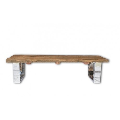 Просторный кофейный стол за которым также можно провести званный обед или ужин для небольшой компании. Уникальный стол со столешницей из состаренного дерева, покрытой прочным стеклом и трапециевидными ножками из хромированного метала также дополненные стеклом.