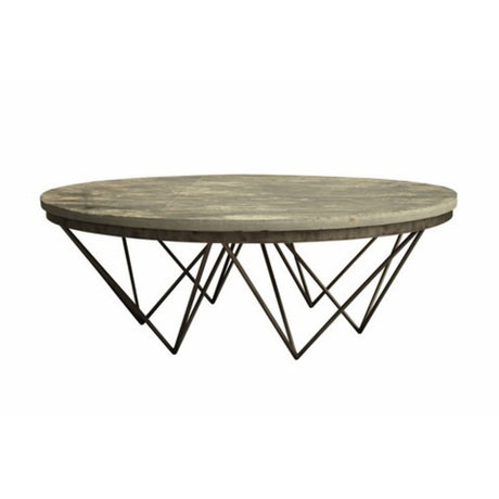 Оригинальный кофейный столик на острых металлических ножках с круглой столешницей из натурального камня темного цвета с фактурой, напоминающей клубы дыма.