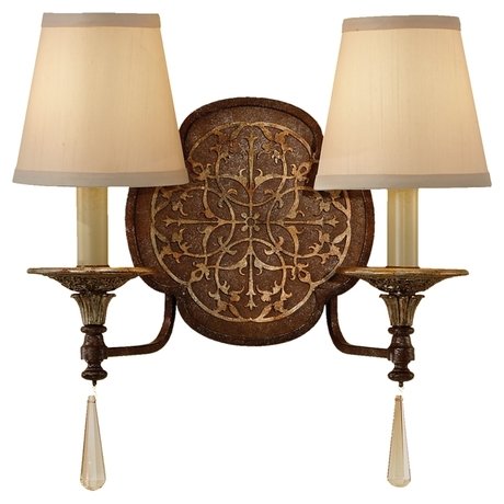 Настенный светильник из стали, стекла и ткани. Цвета отделки каркаса – британский бронзовый и окисленный бронзовый. Модель рассчитана на две лампочки макс. мощностью 60 Вт.