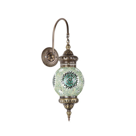Настенный светильник из латуни в ярко выраженном восточном стиле, словно из покоев дворца Шахерезады. Бра выполнен из латуни, с мозаичным плафоном нежных зеленых оттенков. Ручная работа.