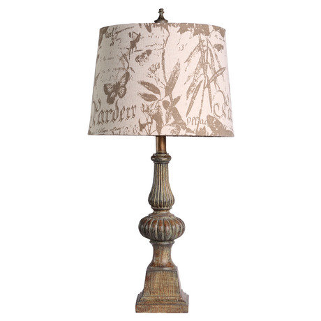 Основание этой лампы выполнено из пластика, имитирующего старую древесину. Кремовый абажур расписан растениями, бабочками и готическими шрифтами. Светильник рассчитан на лампу с цоколем Е27.