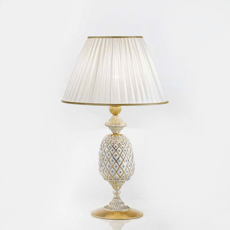 Настольная лампа с керамической вазой бежевого цвета и основанием из кованного металла. Текстильный абажур белого цвета с золотым кантом.