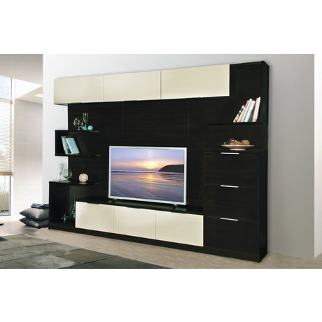 Гостиный гарнитур Веросса имеет прямую форму, современный дизайн, очень практичен и функционален. В тумбе под ТВ три вместительных горизонтальных выдвижных ящика, справа - три вертикальных выдвижных ящика. Сверху - секции с откидными дверьми без полок внутри. Все элементы крепятся на заднюю стеновую панель, которая является частью конструкции, к стене гарнитур не крепится.