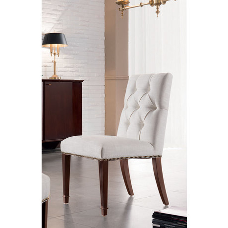 Мягкий стул обит нежным кремовым велюром. Ножки в отделке шпон махагона. Спинка обита тканью со стежкой капитоне, спинка сзади и сиденье снизу декорированы гвоздиками. Каркас сделан из массива дерева.