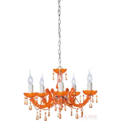 Яркий оранжевый светильник сделан из пластика, материала подчеркнуто современного. Патроны в виде оплавившихся свечей, "подсвечники" и подвесы классических форм отсылают нас к историческим эпохам барокко и рококо. Этот контраст делает этот светильник по-настоящему ярким акцентом в интерьере. Каркас выполнен из металла. Светильник рассчитан на 5 ламп с цоколем Е14 мощностью до 40 Вт.