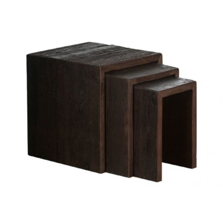 Набор Мануэль — столики-матрешки. Три столика легко превращаются в один. Стоит лишь спрятать два маленьких под один большой. Изготовлены столики из вяза с отделкой под дуб. С поверхности удалены мягкие волокна, благодаря чему, она выглядит более рельефной.