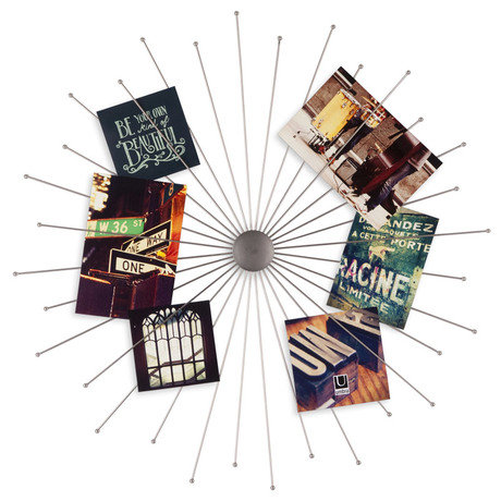 Добавьте комнате солнечной энергии! Держатель для фотографий, вдохновленный солнцем, может удерживать между своими металлическими лучами записки, открытки и снимки самого разного размера. Крепится к стене всего одним шурупом, а заодно дарит море позитивной энергии.