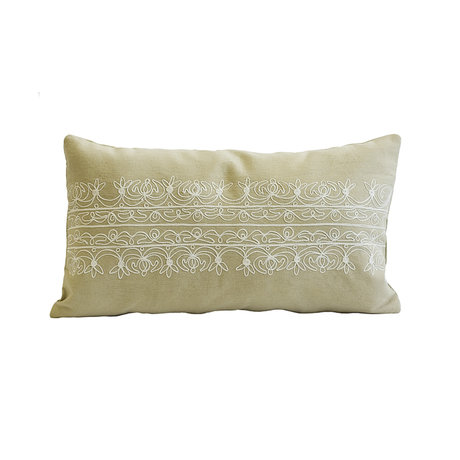 Подушка Ornamento вышита вручную сутажной нитью (хлопчатобумажной тесьмой, состоящей из двух скрученных жгутов, соединенных вдоль друг с другом). Эта старинная техника зародилась во Франции в первой половине ХIV века. Ее использовали при производстве женского платья и украшений.
