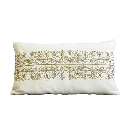 Подушка Ornamento вышита вручную сутажной нитью (хлопчатобумажной тесьмой, состоящей из двух скрученных жгутов, соединенных вдоль друг с другом). Эта старинная техника зародилась во Франции в первой половине ХIV века. Ее использовали при производстве женского платья и украшений.