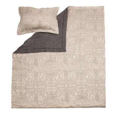 Покрывало «Палаццо» имеет большой размер и подойдет для широких двуспальных кроватей. Оно изготовлено из 100-процентного льна и имеет бежевый оттенок с рисунком темно-серого цвета.