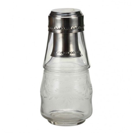 Нарядный и строгий графин выполнен из стекла с металлической крышкой. Модель дополнена стеклянным стаканом с металлическим основанием. Детали изделия декорированы растительным орнаментом.