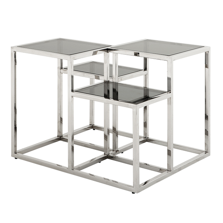 Кофейный столик Smitson выполнен из нержавеющей стали, столешницы изготовлены из тонированного стекла. Модель представляет собой двухуровневую конструкцию из совмещенных столиков. Дизайн изделия предполагает современный стильный внешний вид.