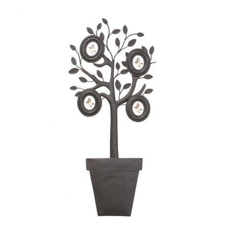 Четыре квадратные рамки для фотографий расположены на черном дереве в горшке. Нетривиальный аксессуар украсит стену помещения и создаст гармоничный образ.