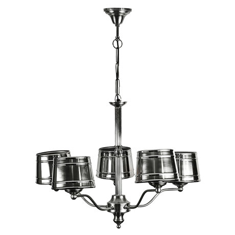 Люстра в стиле хай-тек. Её подвесная конструкция будет эффектно отражать световой поток пяти своих ламп. Цепь, стильные плафоны – всё выражено в аккуратном лаконичном дизайне. Серебряный блеск аксессуара поддержит идентичную отделку.