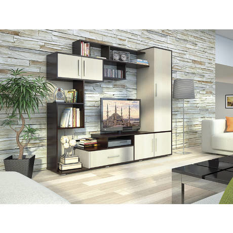 Стенка Диско выполнена из ЛДСП двух цветов: каркас выполнен в цвете «венге», а фасад в цвете – «дуб кремона». Такое сочетание оттенков привносит в помещение атмосферу тепла и домашнего уюта. В такой гостиной будет приятно отдыхать вам и вашей семье.