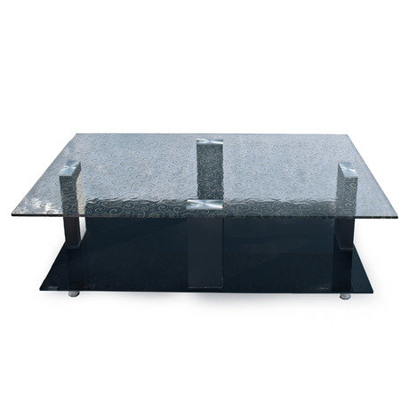 Сочетание металла и стекла делает журнальный столик 634 оригинальным, необычным. Со стороны кажется, что вместо столешницы уложена тонкая ледяная пластина с вычурными морозными узорами. Но в отличие от ледяных декораций, стеклянные завитушки никогда не растают.