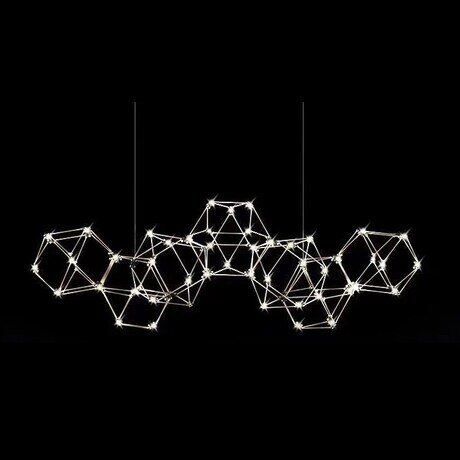 Люстра Bjork в линию хром без вставок (9) L 140 смДизайнерская люстра Bjork small в линию без вставок ручной работы будет эффектно смотреться в современной обстановке квартиры, дома, офиса, кафе, отеля. Оригинальная конструкция из многогранников выполнена из сегментов, для изготовления которых используются тонкие прутки прочной нержавеющей стали. В качестве источников света применяются светодиоды, что подчеркивает идеальную геометрию и создает мягкое рассеянное освещение. Лаконичное исполнение позволяет разместить такой светильник в любом помещении.Цоколь:LEDЦветовая температура:3000КДиммирование:нетКоличество светодиодов:108Световой поток, lm:6480Мощность, вт:54Степень защиты:IP20Крепление:Потолочная площадка; Цанговый подвесДлина тросов:150 см