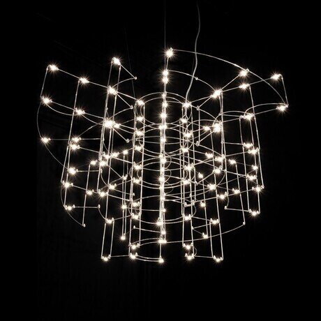 Люстра Chill B D100 хром Подвесной светильник Chill B похож на водопад из переливающихся огоньков. Тонкие линии каркаса создают окружности, перетекающие одна в другую и расположенные на разных уровнях. Нестандартная геометрическая композиция подчеркивает футуристичный дизайн модели. Основой конструкции служат прутки из блестящей нержавеющей стали, источниками света – светодиоды. Изделие собирается вручную. Люстра лаконичного оригинального дизайна удачно вписывается в современную обстановку дома, квартиры, офиса, ресторана. Гармонирует с эстетикой минимализма, хай-тека, лофта. Становится ярким акцентом интерьера.Цоколь:LEDЦветовая температура:3000КДиммирование:нетКоличество светодиодов:107Световой поток, lm:6420Мощность, вт:54Степень защиты:IP20Крепление:Потолочная площадка; Цанговый подвесДлина тросов:150 см
