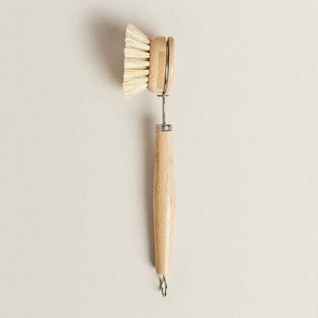 Щетка для посуды с ручкой из бамбукового дерева и основанием с волокнами. Кольцо из нержавеющей стали для подвешивания в любом месте кухни.