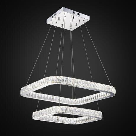 Корпус светильника металлический с глянцевым хромированным покрытием. Два хрустальных кольца квадратной формы, высоту и угол наклона каждого из которых можно легко изменить, подвешены на утончённых стальных тросиках. Размер светильника 70х70см, высота 25-160см. Источником света являются встроенные светодиоды мощностью 140Вт, свет безопасный для глаз, без мерцания и пульсаций.