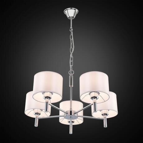 В изделии 5 ламп с цоколем Е27 максимальной мощностью для ламп накаливания 75Вт (в комплект не входят, приобретаются отдельно). Диаметр светильника 60см, высота легко регулируется в диапазоне от 45см до 1,12м. Модель подходит для всех типов потолков, в том числе натяжных, тип крепления – крючок.