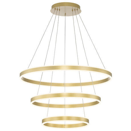 Светодиодная люстра Citilux Дуэт CL719682 выполнена в современном стиле. Корпус металлический, цвет благородное золото. Люстра каскадная из трёх подвесных колец, высоту и угол наклона каждого из которых можно легко изменить. Кольца - светодиодные модули изготовлены из алюминиевого профиля, рассеиватель из оптического полимера. Наличие источников света с двух сторон профиля позволяет равномерно осветить всё помещение.