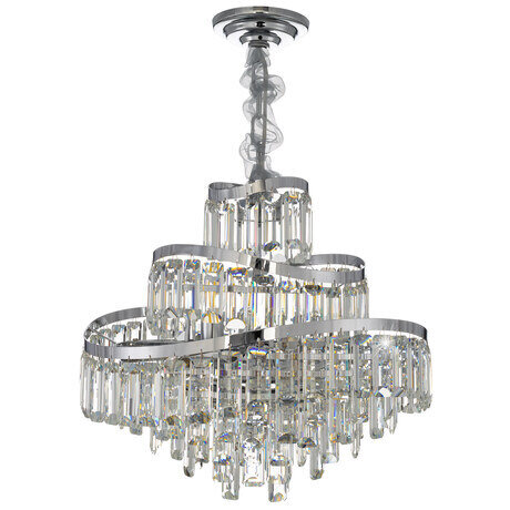 Металлический каркас с глянцевым хромированным покрытием притягивает взгляд своим холодным блеском. Изогнутые, словно морские волны, кольца переливаются на свету, создавая динамичный и изменчивый образ в зависимости от ракурса. Роскошный облик формируют прямоугольные хрустальные подвески с современной огранкой — их кристальная чистота и геометрическая точность подчёркивают изысканность формы. Каждая грань хрусталя ловит свет, превращая его в тысячи искрящихся бликов, которые наполняют пространство торжественным сиянием.