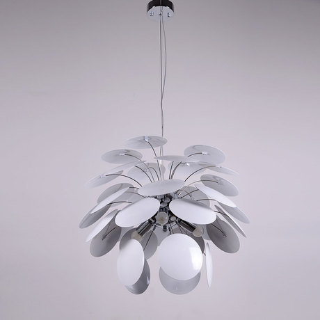 Стильный светильник выполнен из множества тонких металлических пластин, выкрашенных в белый глянцевый цвет. Будто распустившиеся или зависшие в воздухе лепестки создают динамичный образ, способный украсить интерьер лучше любого декора.