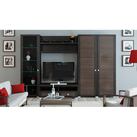 Уютная гостиная с набором самой необходимой современной мебели в приятной цветовой гамме: каркас выполнен в благородном цвете венге цаво, а фасад имеет два оттенка - венге цаво и каналы дуба. В состав набора входит: полка малая - 2 шт., тумба малая - 1 шт., шкаф низкий с глухими дверями - 2 шт., шкаф низкий со стеклянными дверями - 1 шт.