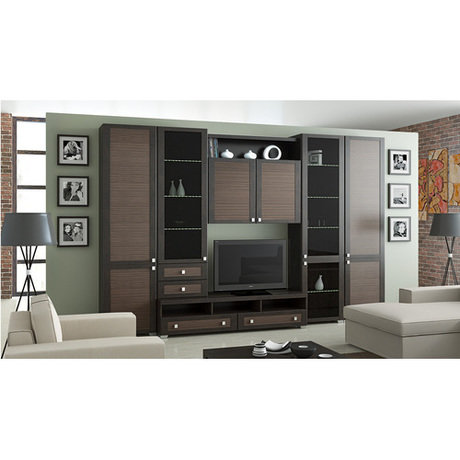 Уютная гостиная с набором самой необходимой современной мебели в приятной цветовой гамме: каркас выполнен в благородном цвете венге цаво, а фасад имеет два оттенка - венге цаво и каналы дуба. В состав набора входит: шкаф высокий с глухими дверями - 2 шт., шкаф высокий со стеклянными дверями - 1 шт., шкаф навесной малый с глухими дверями - 1 шт., полка малая - 1 шт., тумба большая - 1 шт., шкаф-надстройка с ящиками - 1 шт.