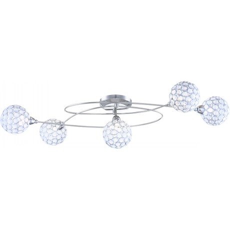 Назначение светильника: для гостиной, Стиль светильника: модерн, Тип: потолочная, Материал светильника: металл, пластик, Диаметр: 840 мм, Высота: 185 мм, Количество ламп: 5 шт, Тип лампы: галогенная, Мощность: 28 Вт, Патрон: G9, Цвет арматуры: хром