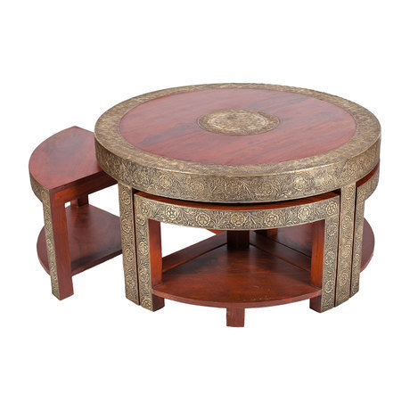Невысокий кофейный столик имеет удобные задвигающиеся табуреты треугольной формы, что значительно экономит пространство в комнате, а его скругленные формы располагают к гармонии и непринужденному общению.