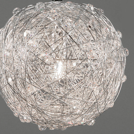 Настенный светильник на хромированной арматуре. Плафон-шар из скрученной алюминиевой проволоки с прозрачными кристаллами. Светильник может использоваться как потолочный.