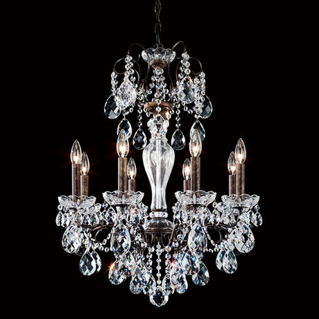 Люстра 8-ми рожковая Sonatina на металлической арматуре цвета античное серебро. Дизайн ламп в виде свечей в подсвечниках. Декор: хрустальные подвески и кристаллы Heritage. Высота светильника регулируется за счет звеньев цепи. Возможны другие варианты хрусталя по типу и цвету, а также различные покрытия металла.