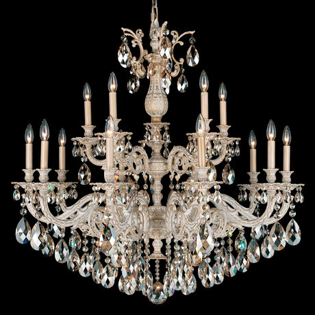 Пятнадцати рожковая люстра из коллекции Milano. Резная арматура цвета французское золото и прозрачные подвески из хрусталя Swarovski SPECTRA.