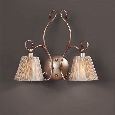 Настенный светильник серии SALMA выполнен из металла с покрытием "состаренное позолоченное серебро". Два световых элемента расположены под абажурами из плиссированной ткани бежевого цвета. Светильник декорирован подвесками из стекла аметистового цвета.