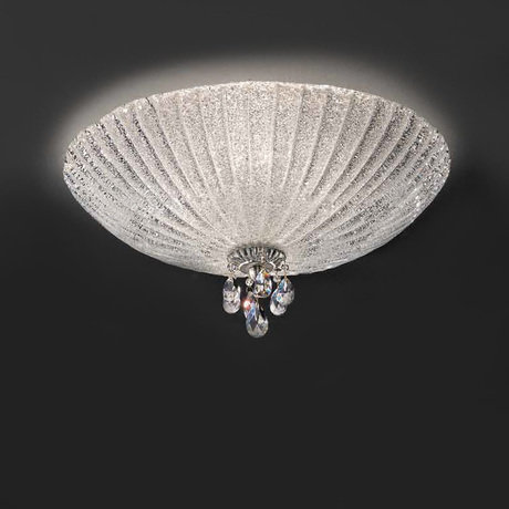 Потолочный светильник с плафоном из прозрачного муранского стекла. Декор: прозрачные хрустальные подвески. Цвет арматуры: золотой. Дизайн: Ufficio Tecnico MM Lampadari. По индивидуальному заказу возможны различные модификации и варианты отделки.