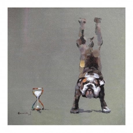 Картина Wooof изображает весьма необычную композицию из перевернутых песочных часов и собаки, стоящей на передних лапах.