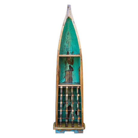 Винный шкаф, выполненный из старой рыбацкой лодки классической правильной формы с сохранением оригинальной многослойной окраски.