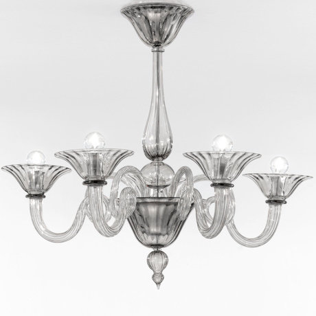 Люстра 5-ти рожковая на хромированной арматуре. Выполнена из прозрачного муранского стекла. Высота светильника регулируется за счет звеньев цепи. Количество лампочек: 5. Мощность: 5 x 40 Вт. Тип лампы: Накаливания, E14.