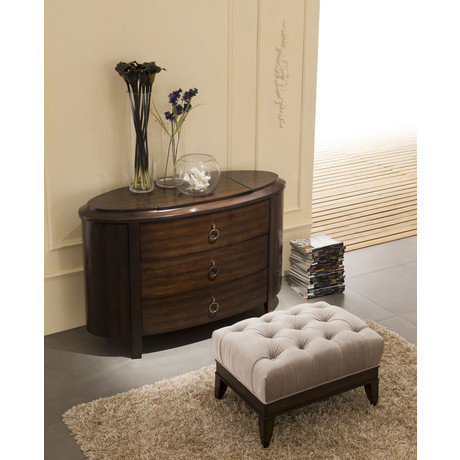 Комод с 3 выдвижными ящиками выполнен в стиле Неоклассика. Отделка шпон махагона. Внутреннее наполнение боковых частей - 1 полка. В столешницу встроено зеркало с подъемным механизмом. Сделан из массива дерева и высококачественного МДФ высокой плотности.
