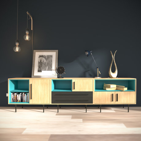 Комбинацию модулей A, D и E из коллекции Tube возможно использовать, как самостоятельно, так и в сочетании с другими модулями из этой коллекции. Комбинация оснащена удобными секциями для хранения, включая открытые ниши, полочки, секции с распашными дверцами двумя выдвижными ящиками. Материалы: шпон дуба, мдф, металл, эмаль, лак