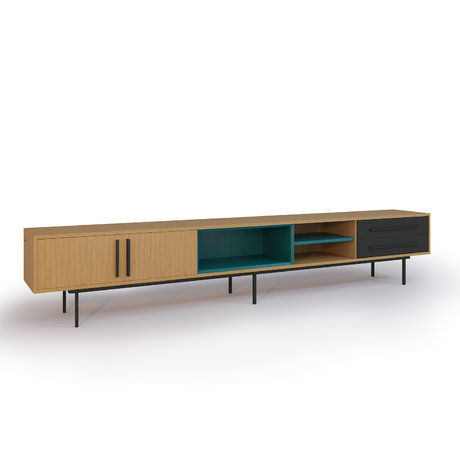 Тумба ТВ Slim из коллекции Tube выполнена из натуральных материалов. Тумба отличается стильным дизайном и функциональностью. Оснащение тумбы - 2 ниши, 2 выдвижных ящика с доводчиками и секция с распашными фасадами. Материал: основание - металл, эмаль черная Ral 9011, корпус - шпон дуба, мдф, ниша и полки-эмаль бирюзовая Ral 5018, фасады ящиков- эмаль black olive Ral 6015, лак.