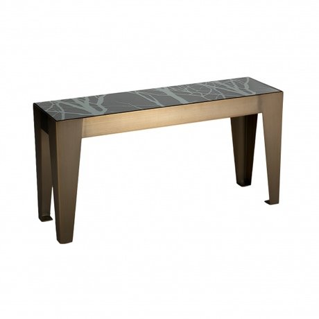 Элегантный журнальный стол с металлическим основанием и узкой прямоугольной столешницей, выполненной из стекла и декорированной абстрактным рисунком, станет неотъемлемым предметом современного интерьера. Изделие может служить подставкой для рамок с фотографиями, цветов или элементов декора и различных мелочей.