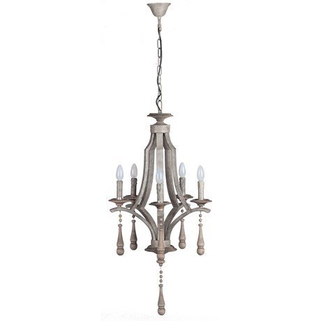 Строгая и оригинальная модель, достойная шикарной парижской гостиной. Эта люстра выполнена из железа и дерева в серо-бежевом цвете. Она имеет оригинальную симметричную форму, лампочки также сделаны «под старину» и в зажженном виде выглядят как свечи. Под каждой такой «свечкой» расположен подвесной декор из деревянных бусин и капель.